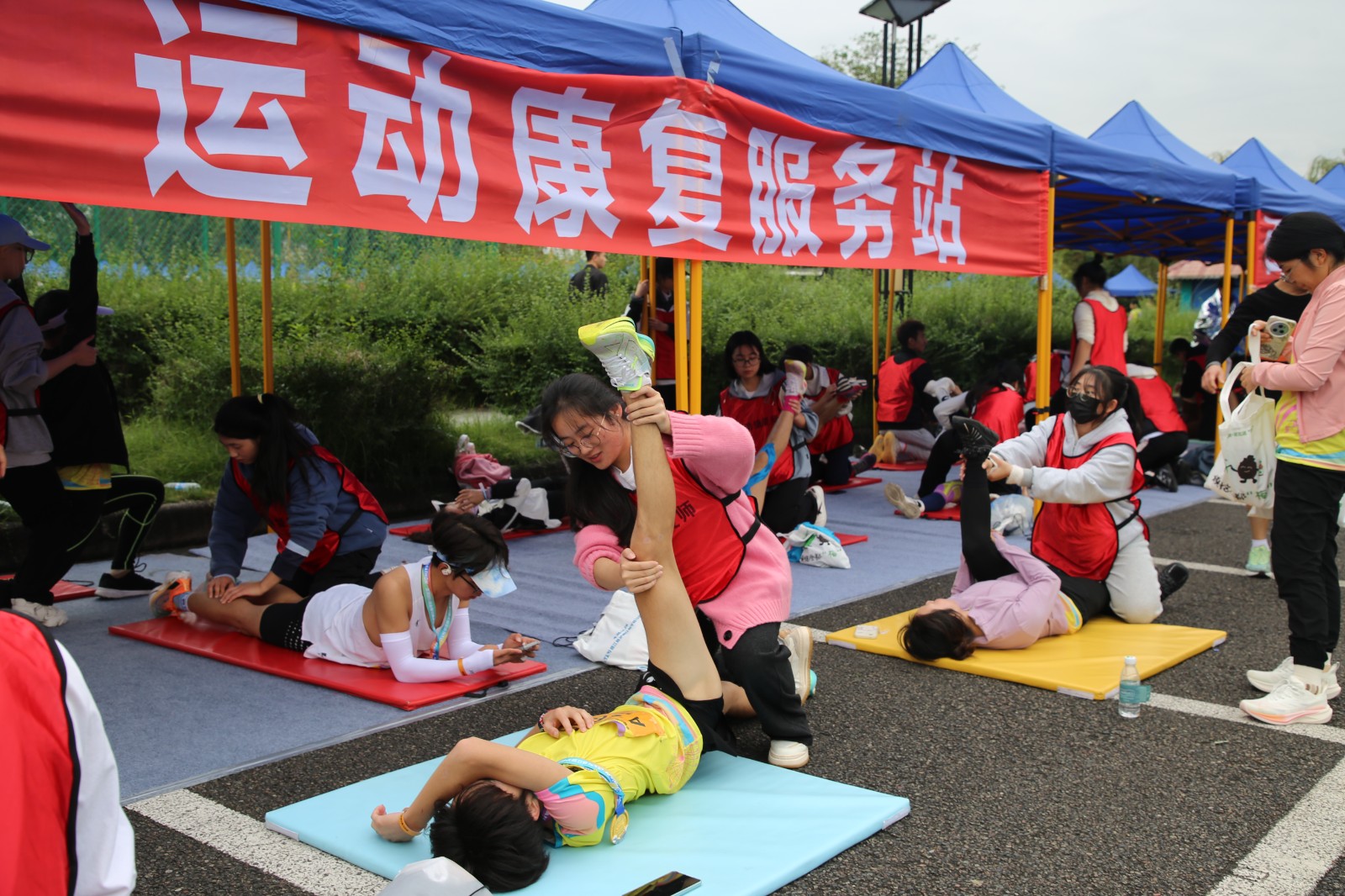 比賽前夕,運動健康中心提前布置現場,科學設置肌貼區、自由拉伸區、運動損傷康復區三個區域,時刻準備為參賽選手提供貼心服務。比賽階段,運動健康中心全程關注賽場狀況,第一時間為有需要的選手提供即時幫助與服務。其專業的指導與賽場服務得到了參賽選手的一致好評。此次馬拉松賽運動健康中心派出專業運動康復師6名,專業教練5名,志愿者30余名,提供賽前肌貼、賽后拉伸、疼痛評估及康復服務等服務共計1500余人次。
